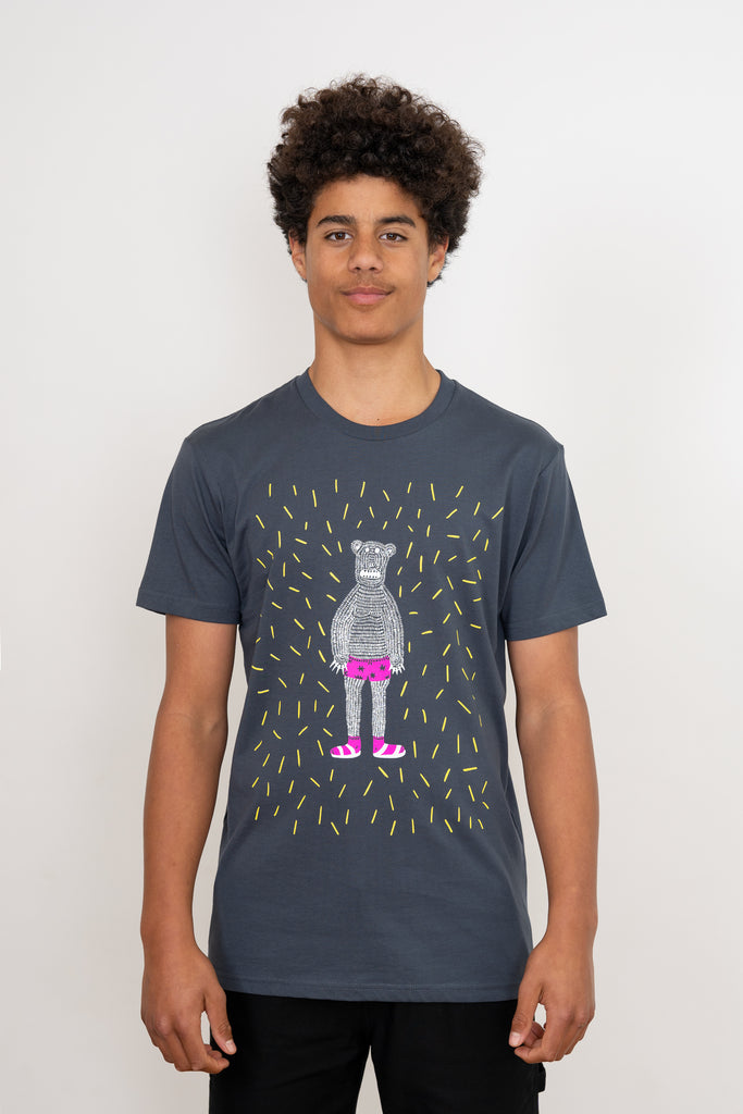 100% combed cotton t-shirt (180 GSM), produced under ethical working conditions and screenprinted in New Zealand using environmentally friendly, organic inks.